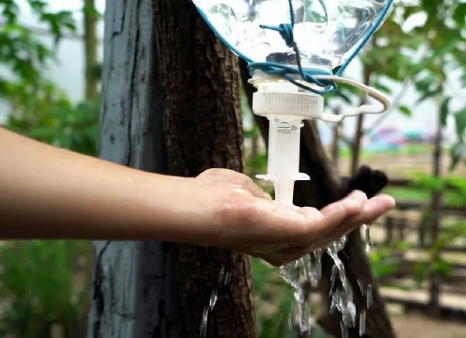 Пробку со шприцем завинчиваю по спирали на горловину емкости. Если поршень весь находится вне бутылки, то вода не течет. Стоит только слегка толкнуть приспособление внутрь баклажки, то жидкость льется. Чтобы полностью блокировать доступ к влаге, надо вытянуть устройство до упора.