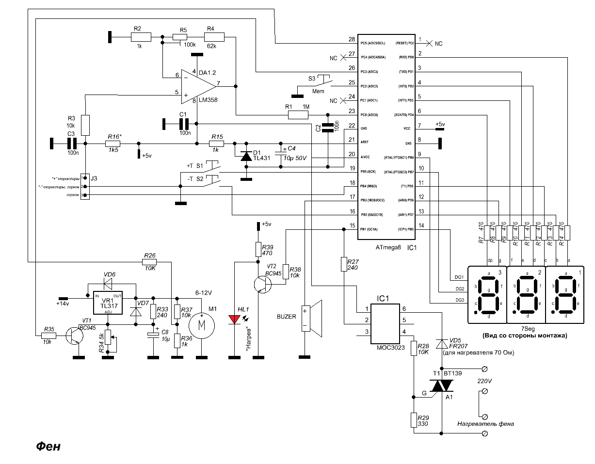 Схема позволяет поддерживать установленную температуру фена, регулировать обороты двигателя вентилятора фена, при выключении фена ждёт, когда температура фена понизится до 50-ти градусов, потом снимает питание с фена. Схема так же, в такой же последовательности выключает фен, если он установлен в держатель фена (на подставку), имеющий встроенный магнит, так как фен для этой цели имеет встроенный геркон.