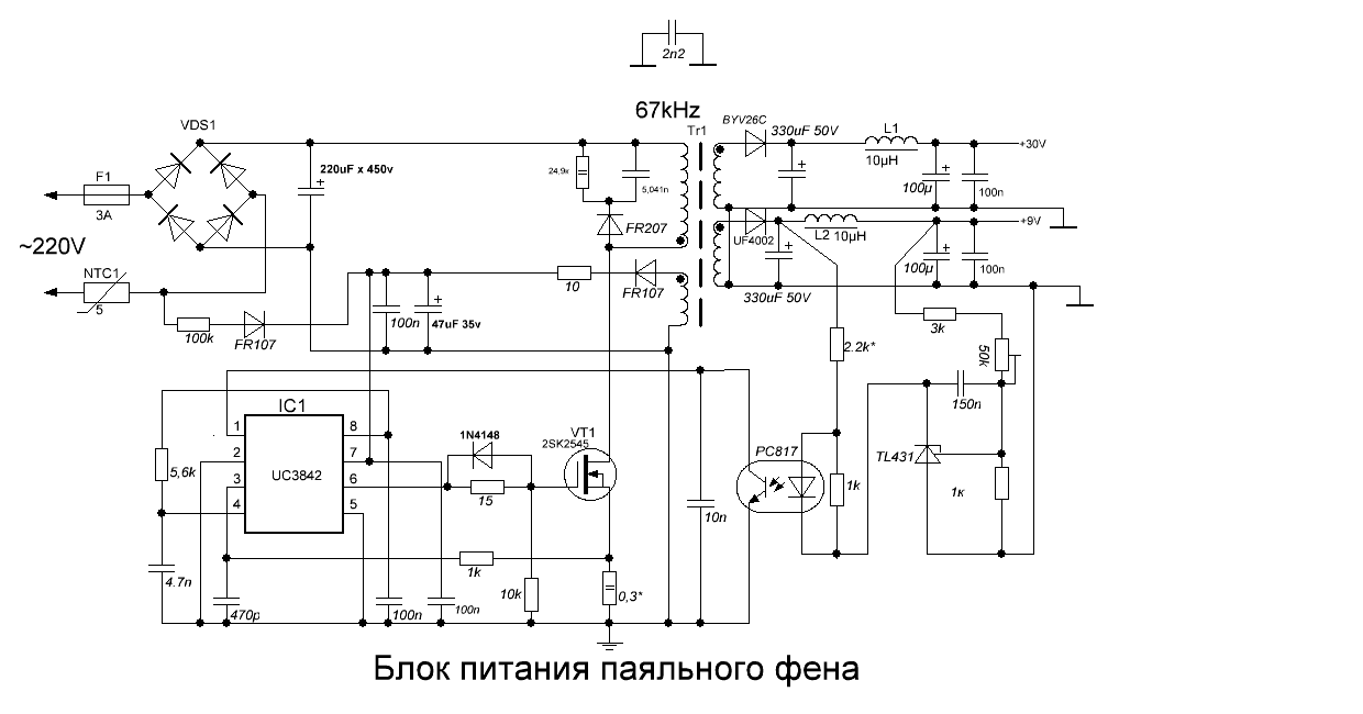 Блок питания для этого контроллера я собрал импульсный. Выходные напряжения блока питания в моём варианте +30 и +9 вольт. Схема собрана на ШИМ-контроллере UC3842.
