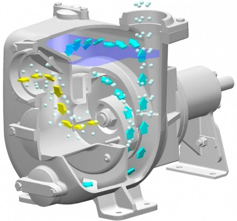Воздух, показанный на рисунке желтым цветом, всасывается в корпус насоса за счет вакуума, который создается путем вращения импеллера (рабочего колеса). Далее происходит смешивание воздуха, попавшего внутрь насоса, с рабочей жидкостью, содержащейся в корпусе агрегата. На рисунке данная жидкость изображена голубым цветом.