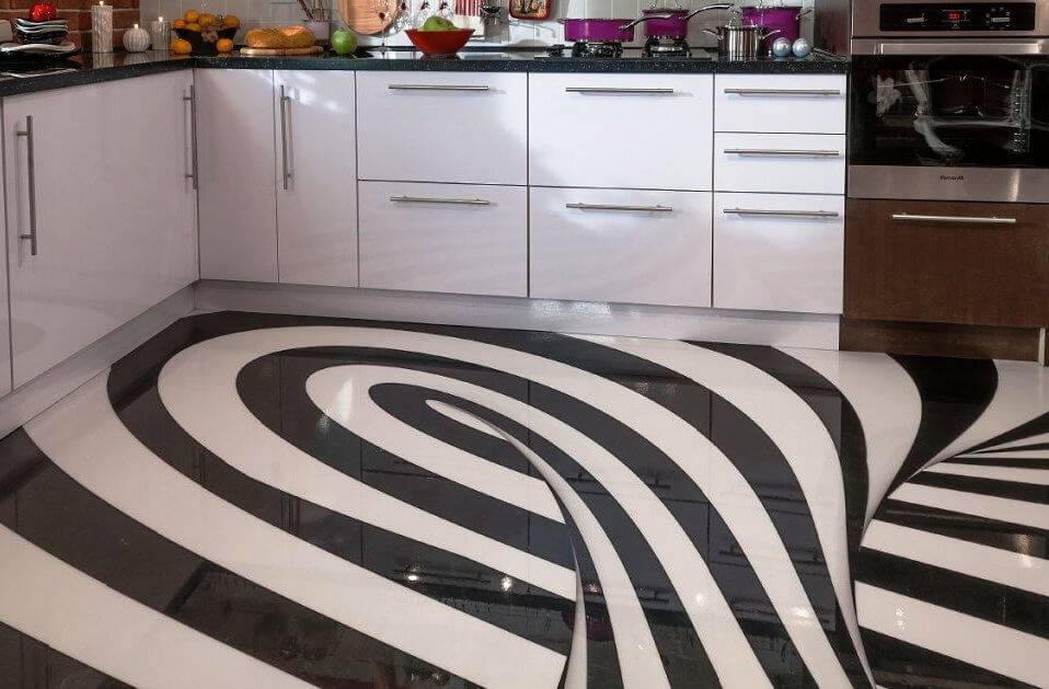 Особо актуальны «наливайки» в местах повышенной проходимости, технических помещениях, ванных комнатах и на кухнях. Однако декоративное покрытие с трехмерным эффектом способно украсить и зал, и спальню, и детскую комнату, будь оно фирменным или самодельным. Наливной пол 3D – многослойное покрытие, включающее: