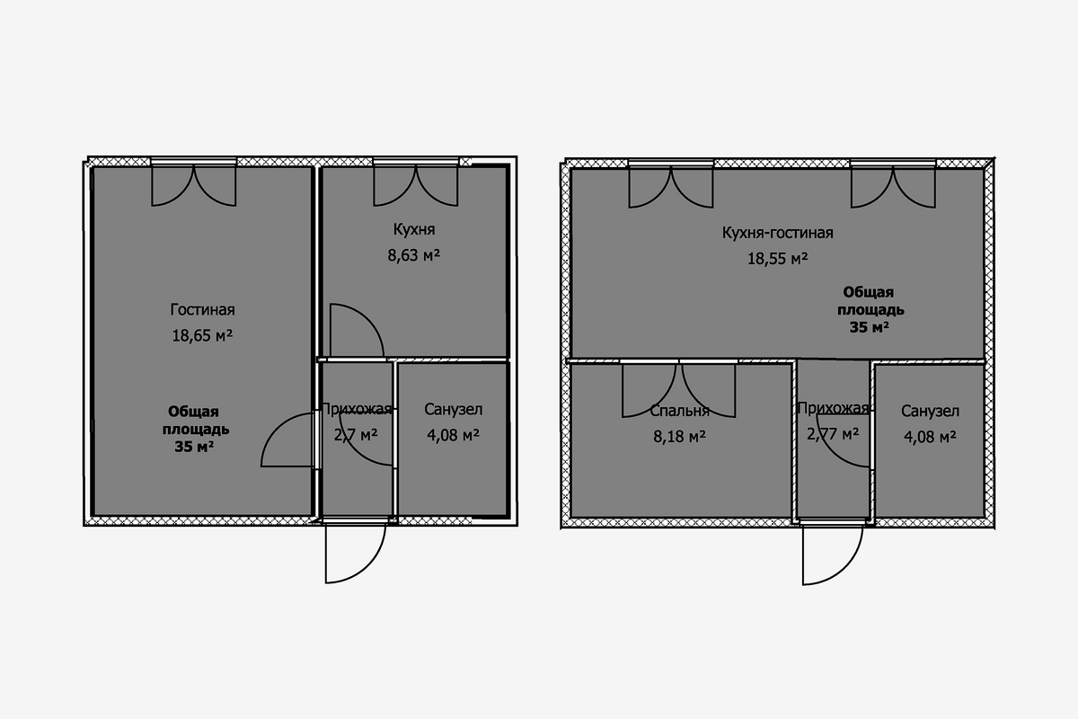 В типовой однушке площадью 35 м² можно объединить кухню и гостиную, а затем выделить небольшую спальню. Но если стены несущие, то любая перепланировка недопустима. В этом случае владельцам, скорее всего, придется спать на раскладном диване