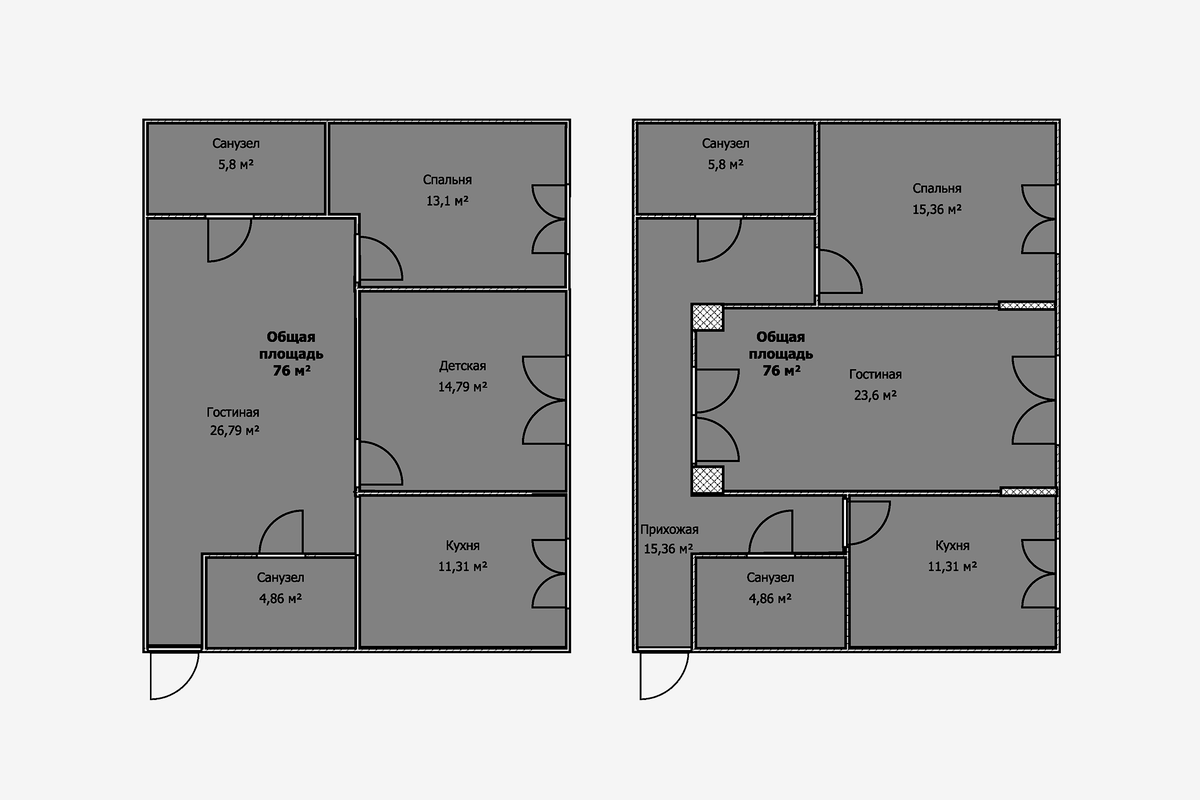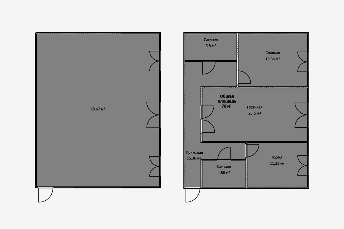 На двух планировках изображена одна и та же квартира, но в первом случае — свободной планировки, а во втором — уже после возведения стен. Мы видим, что площадь уменьшилась почти на три квадратных метра. За них покупатель переплачивает в среднем около полумиллиона рублей