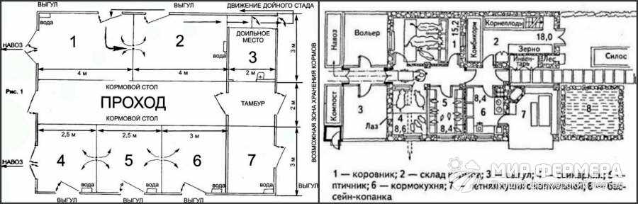 - Наличия и состава помещений специального и служебного назначения — зала для кормления, ветеринарного пункта, цехов раздоя и осеменения.