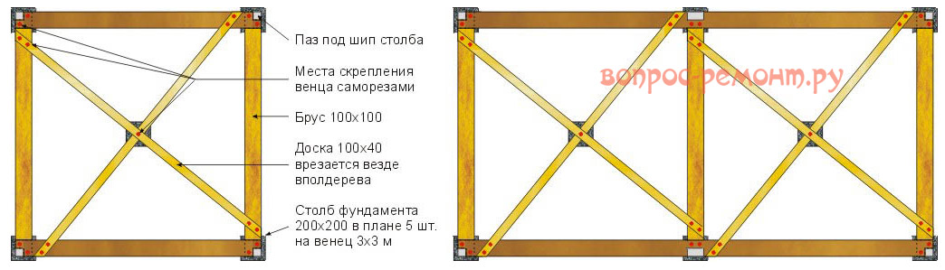 - Весьма желательно угловые столбы (тот же брус 100х100) поставить на т. наз. четвертной шип, подкрепив уголками, см. рис. справа выше, а большие промежуточные каркаса 6х3 – вполдерева, что отмечено на схеме.