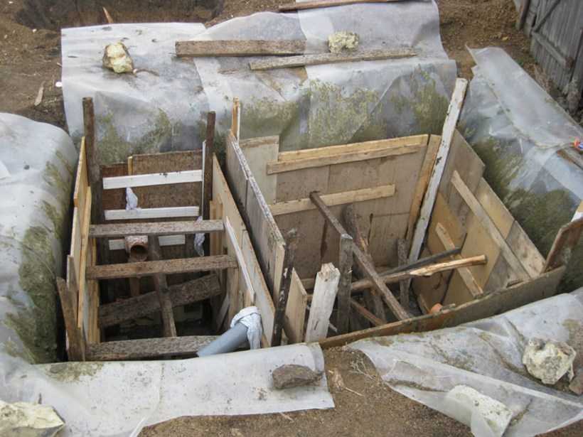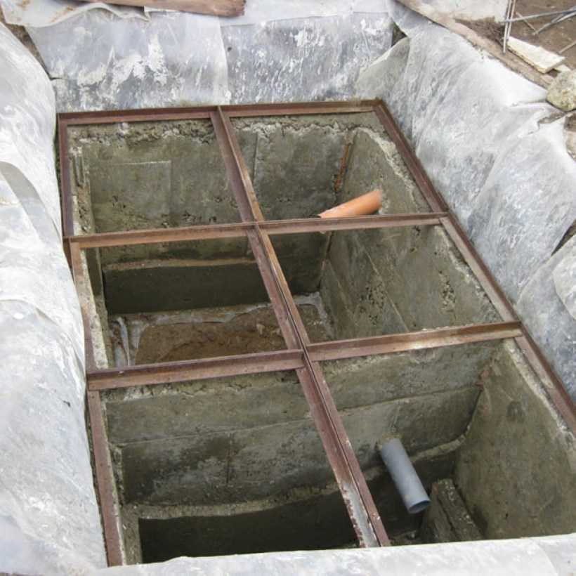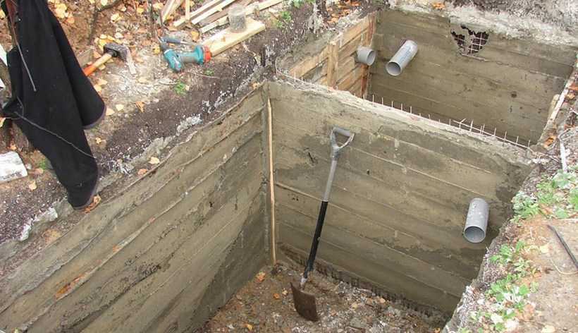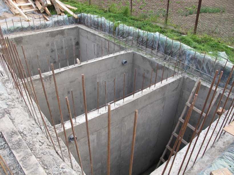 - Монолитный железобетон. Самая прочная и надежная конструкция, но самая длительная по срокам изготовления. Помимо котлована необходимо построить опалубку, провести армирование, заложить стаканы под трубопроводы, залить и уплотнить бетонную смесь, а затем ждать месяц пока бетон созреет до проектной прочности.