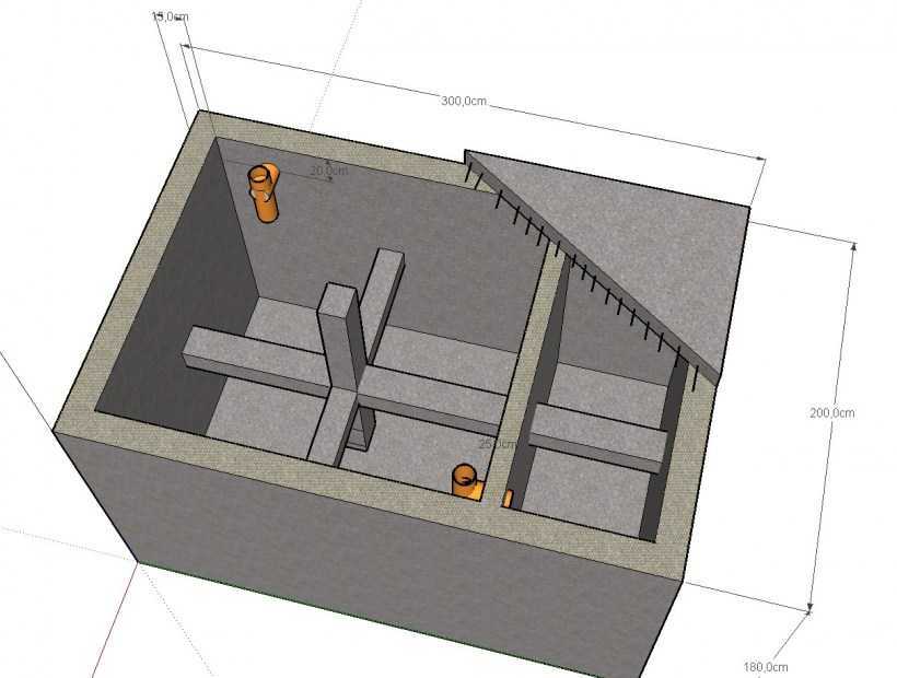 После залива бетона за счёт толщины стенок, размеры сократятся до 2 на 3 метра в плане. По строительным нормам объем камеры должен превышать трёхсуточный слив.