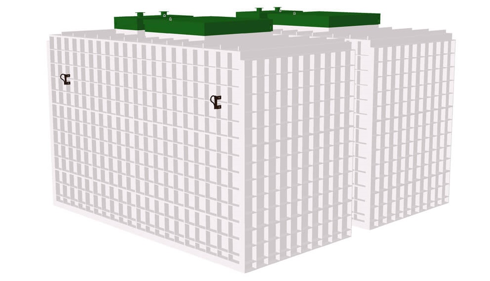 Канализация имеет усиленный каркас. Состоит из трех отсеков и двух технологических отверстий сверху. В первом стоки разделяются на тяжелые и легкие. Первые оседают, а вторые перетекают в следующие отсеки, где происходит бактериальная очистка в среде с отсутствием кислорода. Степень очистки стоков доходит до 85%, поэтому вода может быть утилизирована в грунт. Ориентировочная стоимость составляет 41 000 рублей.