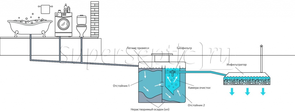 Все виды септиков без откачки для частного дома работают по одному принципу, включающему следующие этапы: