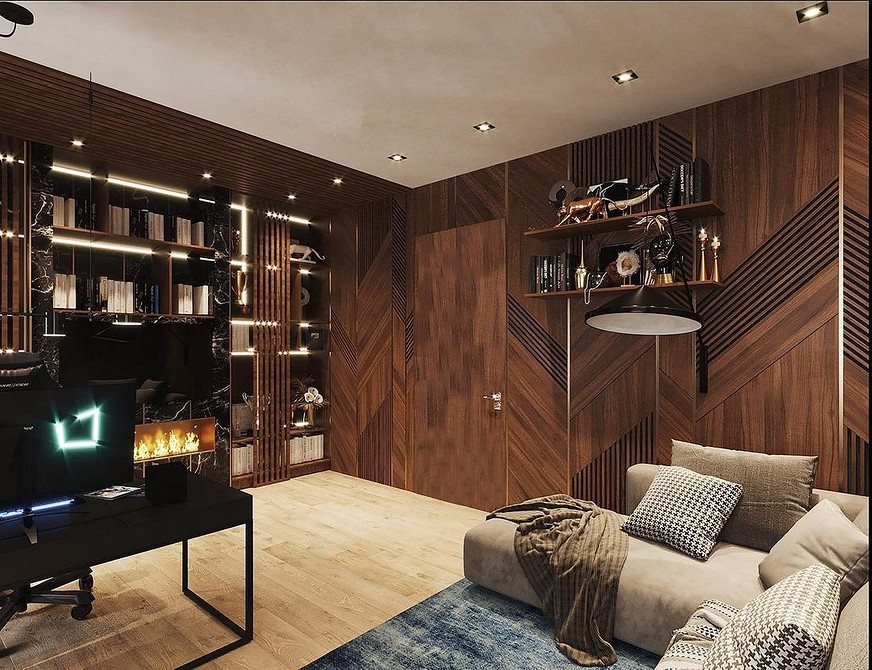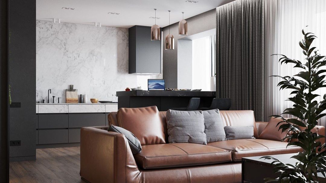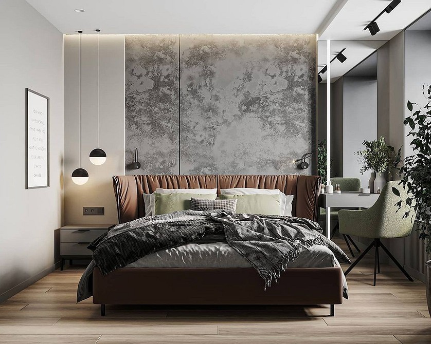 Серый цвет чаще выступает фоном для коричневой мебели. Он создает легкий и приятный контраст и не утомляет обилием цветов. Звучание интерьеру могут придать яркие акценты или объемные фактуры – принты, 3D-панели или плитка, имитации кирпичной кладки, дерева, бетона. Чтобы комната не казалась громоздкой и тяжелой, избегайте массивной мебели.
