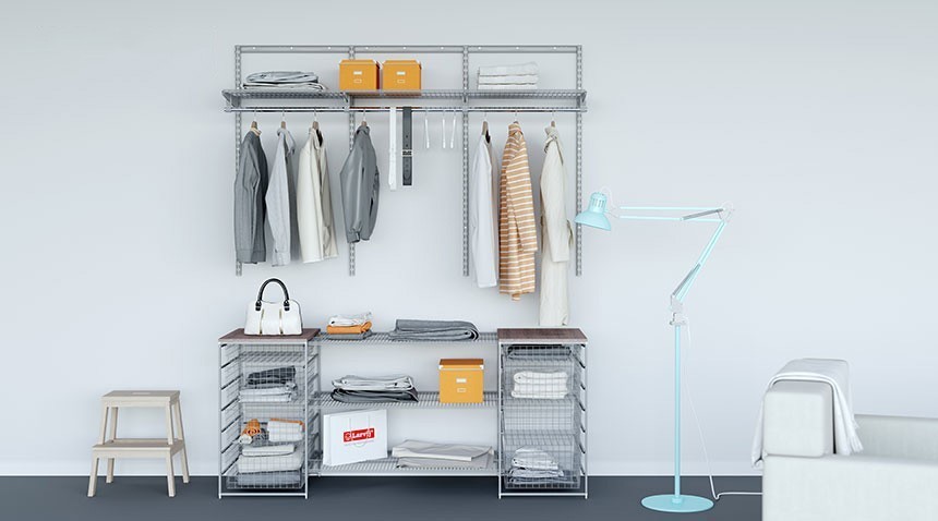 ДЛЯ ЛЮБОГО ПОМЕЩЕНИЯЗамените громоздкие шкафы для хранения на современную конструкцию. Разместите систему в гардеробной комнате, в кладовой, ванной, на мансарде или как наполнение для шкафа-купе. Элементы из высококачественной стали выдерживают значительные нагрузки, поэтому смело используйте систему в гараже или мастерской для хранения спортивного инвентаря, инструмента и оборудования.