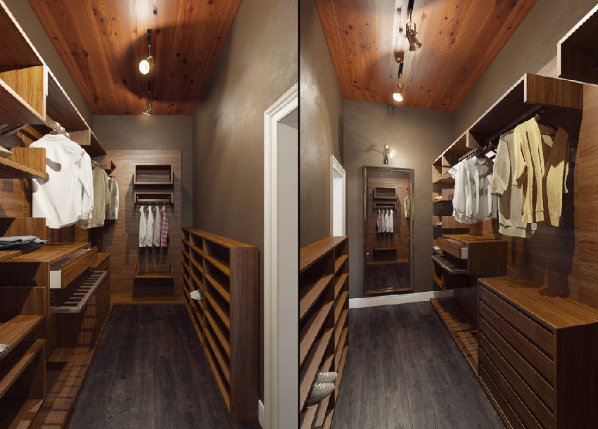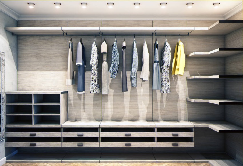 При комбинировании материалов, модулей можно сделать открытую или закрытую гардеробную с деревянными, металлическими или пластиковыми полками и ящиками. Первые хорошо проветриваются, а вторые не дают пыли попадать на одежду. Также можно сделать гардеробную с фасадом для уникальности интерьера или для создания отдельной комнаты под одежду. Двери следует подбирать под габариты помещения, учитывать место расположения шкафа.
