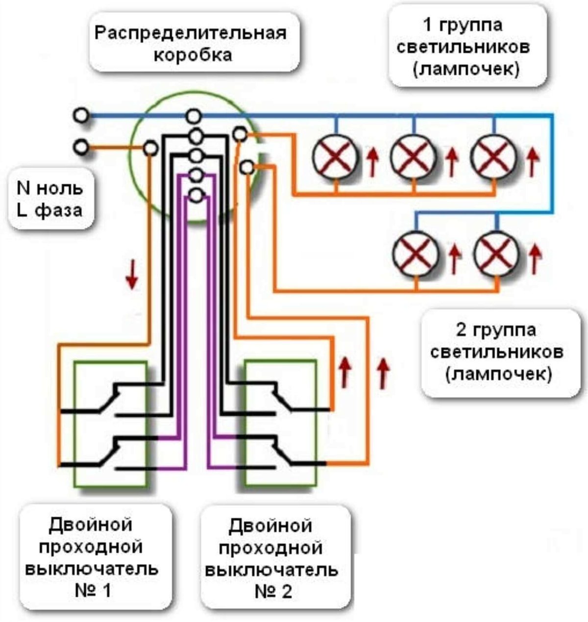 Именно поэтому возникает вопрос, как сделать возможным включение лампочки сразу с двух и более мест? Поделиться с друзьями: Вам также может быть интересно. Рассмотрим принцип действия данных устройств согласно следующему фото: В данной схеме смонтировано: источник питания В фаза и ноль ; распределительная коробка, в которой выполняется коммутация; 2 группы цепей освещения для примера это может быть люстра и светодиодная подсветка в зале или комнате. Схема управления двумя отдельными светильниками из четырех точек Как мы уже заметили, схему управления освещением можно наращивать бесконечно.