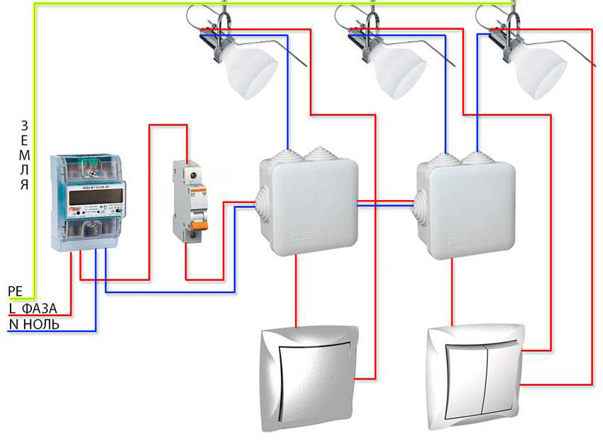 До распределительной коробки от РЩ провод ставится большим сечением с учетом суммарной мощности двух групп освещения. Для монтажа потребуется еще несколько элементов: