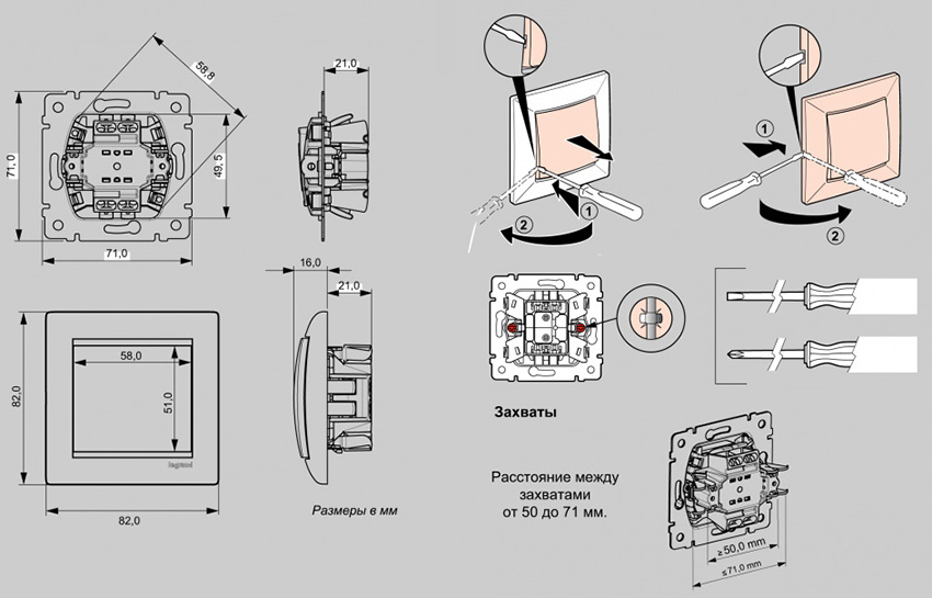- С торцов демонтированной части выключателя имеется два зубца – их нужно поддеть при помощи шлицевой отвертки.