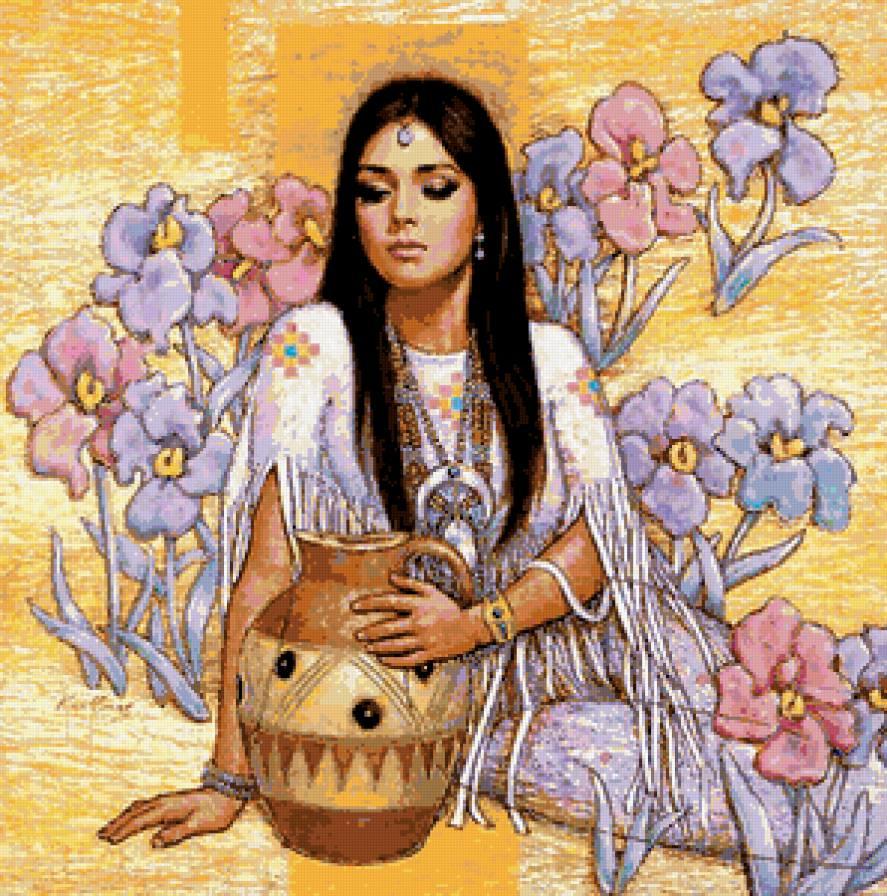 В Интернете можно найти много готовых схем сюжетами на тему девушек и женщин. Сюжеты пестрят большим разнообразием, что позволяет выбрать вариант, отвечающим вкусовым предпочтения рукодельницы. Большой популярностью пользуются картины девушек с цветами.