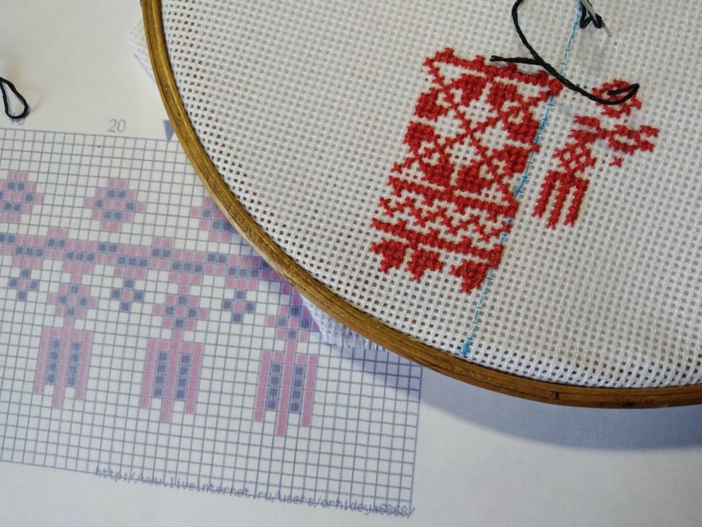 Если узор шьется одним цветом, то сначала определитесь с порядком: столбцами, рядами или участками вышивки. Попробуйте выделить основные части орнамента для удобства.