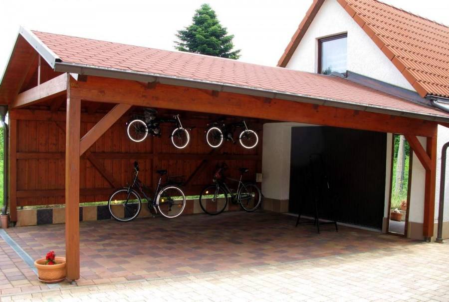 Помимо простоты конструкции навесу, который построен вплотную к дому, не так страшен ветер, как постройке стоящей обособленно.