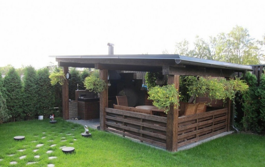 Простейшая крытая постройка может выполнять функцию беседки для отдыха. Под надежной кровлей удобно разместить стол и скамейки, а также установить печь с дымоходом. В случае с грилем основным строением является именно мангал, а навес служит для удобства его использования: например, для приготовления пищи во время непогоды.