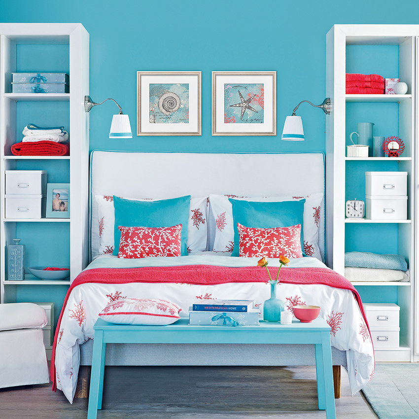 Выбирая голубой цвет в качестве основы, а нежный тёплый оттенок зелёного качестве дополнительного и добавив аксессуары пастельных или бледно-жёлтых оттенков, ваша спальня превратится в комнату, где царит лето.