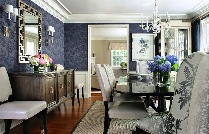 Синяя отделка является удачным решением для просторной светлой гостиной, выходящей на южную сторону. Данный цвет лучшим образом подходит для современных направлений. Добавив немного позолоты, синяя отделка хорошо впишется в неоклассику. При отделке помещения чаще всего используется вариант оклеивания стены за диваном однотонными синими изделиями. Для этого используются насыщенные тона кобальтового, сапфирового и василькового оттенка, обои индиго. Такая поверхность дополняется светлой отделкой остальных стен, что позволяет наполнить помещение воздухом.