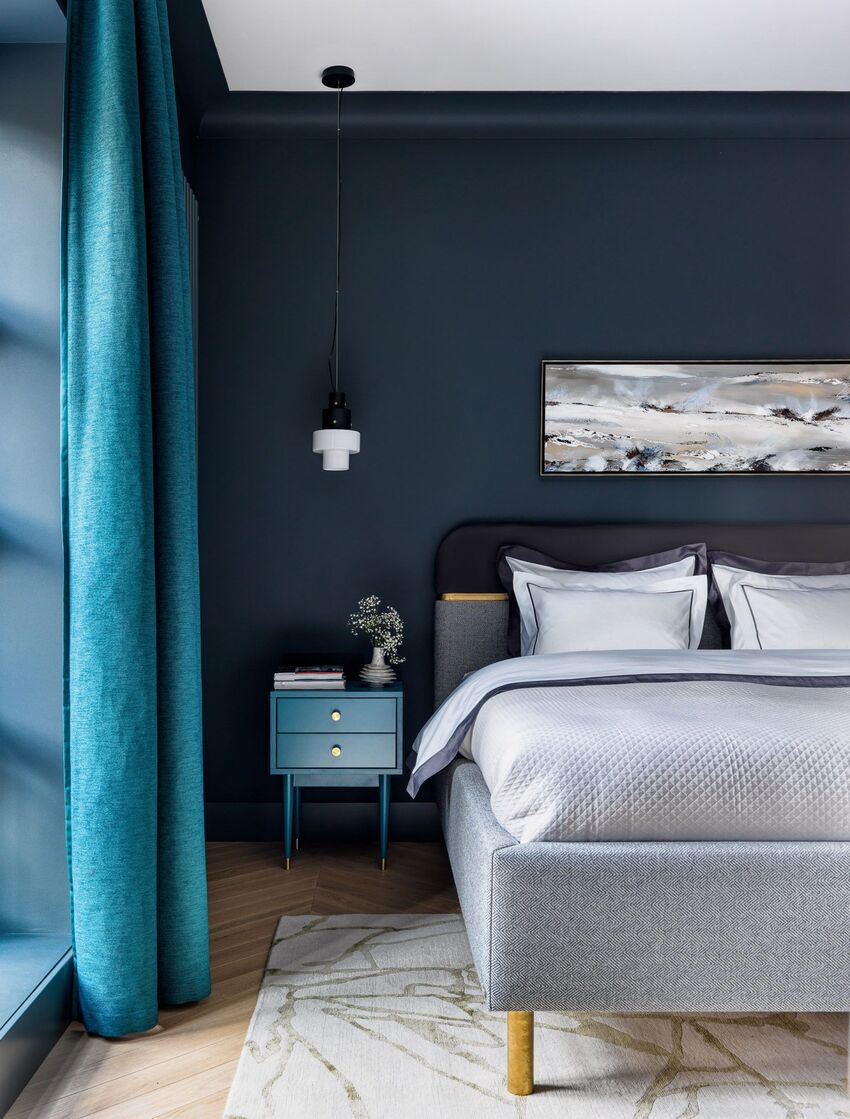 Синий цвет в интерьере спальни вполне уместен в разных его оттенках