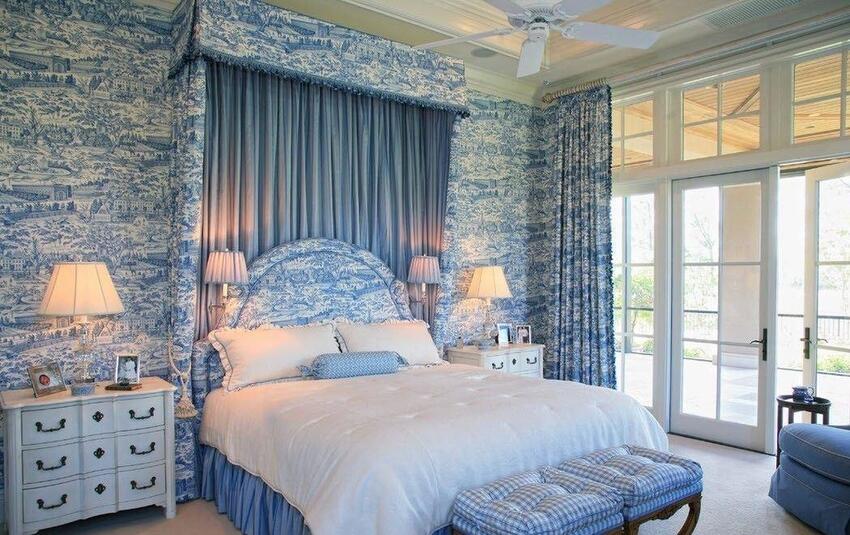 Обычно в обустройстве применяются обои синего цвета для спальни, а потолок и пол декорируются контрастными либо нейтральными оттенками.