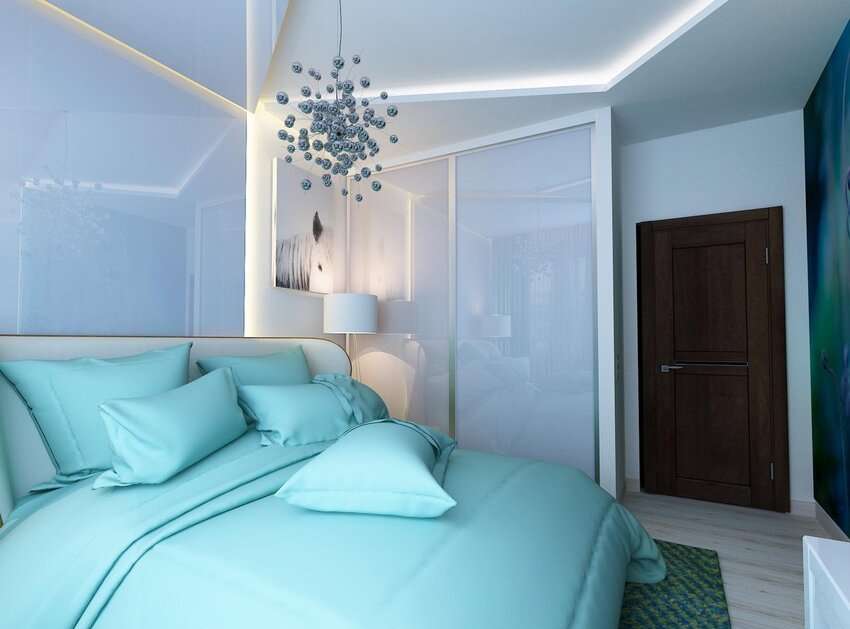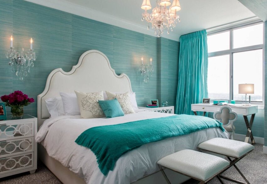 Чаще всего дизайнеры для оформления спальни используют бирюзовый цвет, небесно-голубой и аквамарин.