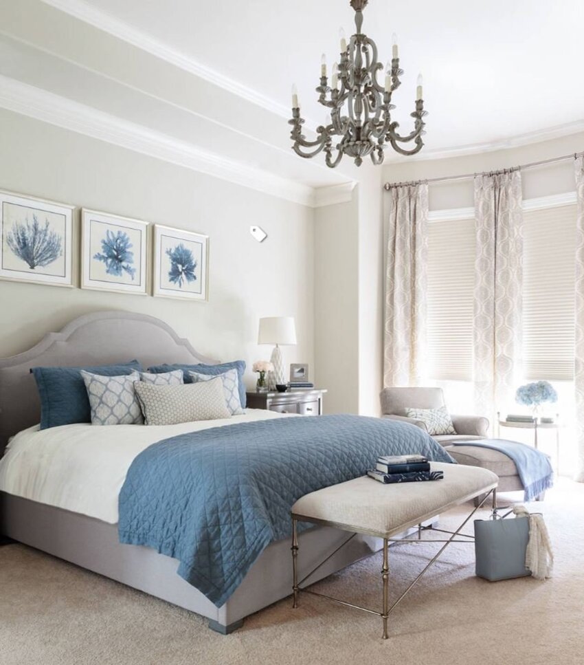 Если голубой цвет выбран в качестве основного, следует использовать разбелённые цвета более нежных оттенков. Чтобы исключить в спальне излишнюю холодность, в качестве дополнительных используются тёплые цвета — бежевый, розовый, коралловый, жёлтый.