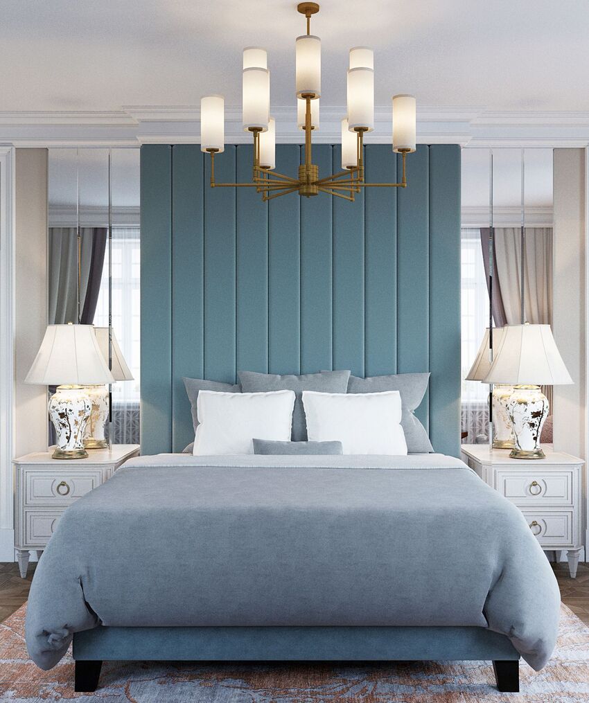 Дизайн спальной комнаты в небесных и серо-голубых тонах считается классикой. Такие оттенки подходят для просторных и небольших спален. Они делают комнату более светлой, расширяют пространство.
