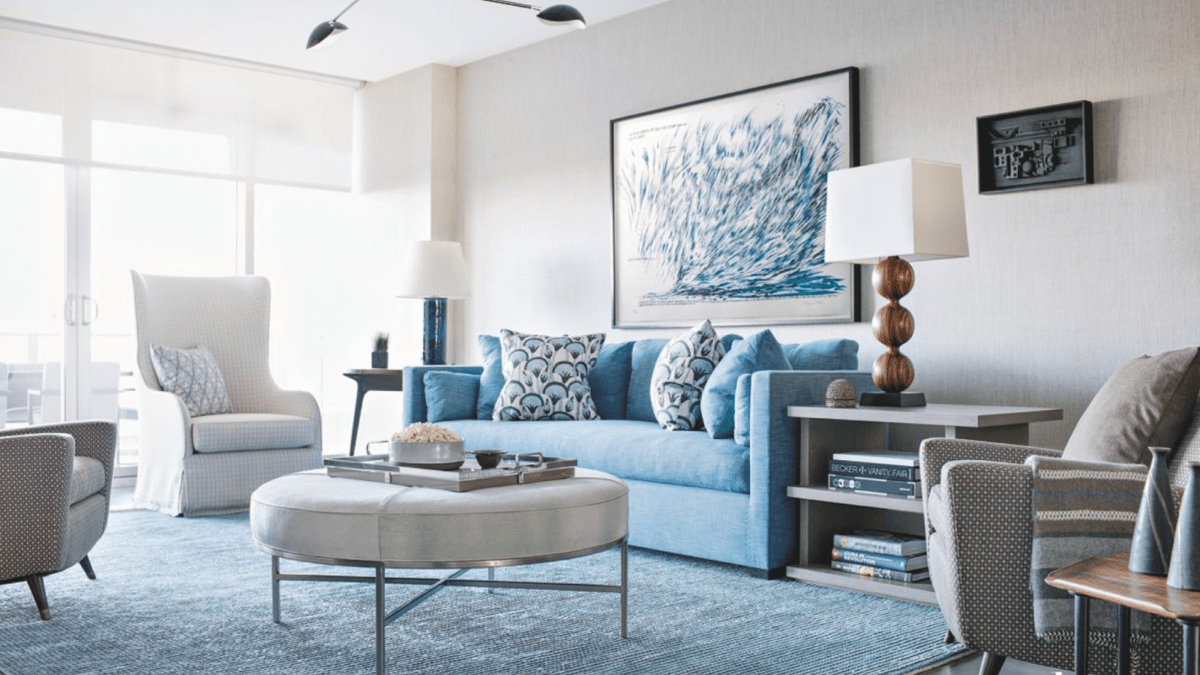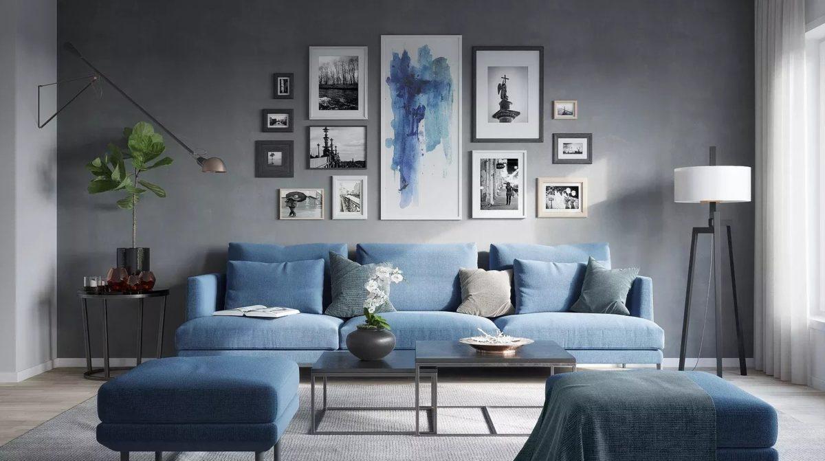 Такой интерьер смотрится расслабляющее и умиротворённо. Глубокий синий цвет хорошо подходит для обивки мягкой мебели, текстильного декора, штор. Если комната не слишком просторная, стены лучше сделать светло-серыми, используя краску или штукатурку. С серо-синей гаммой хорошо сочетается серебряный цвет, а также керамогранитная плитка под камень.