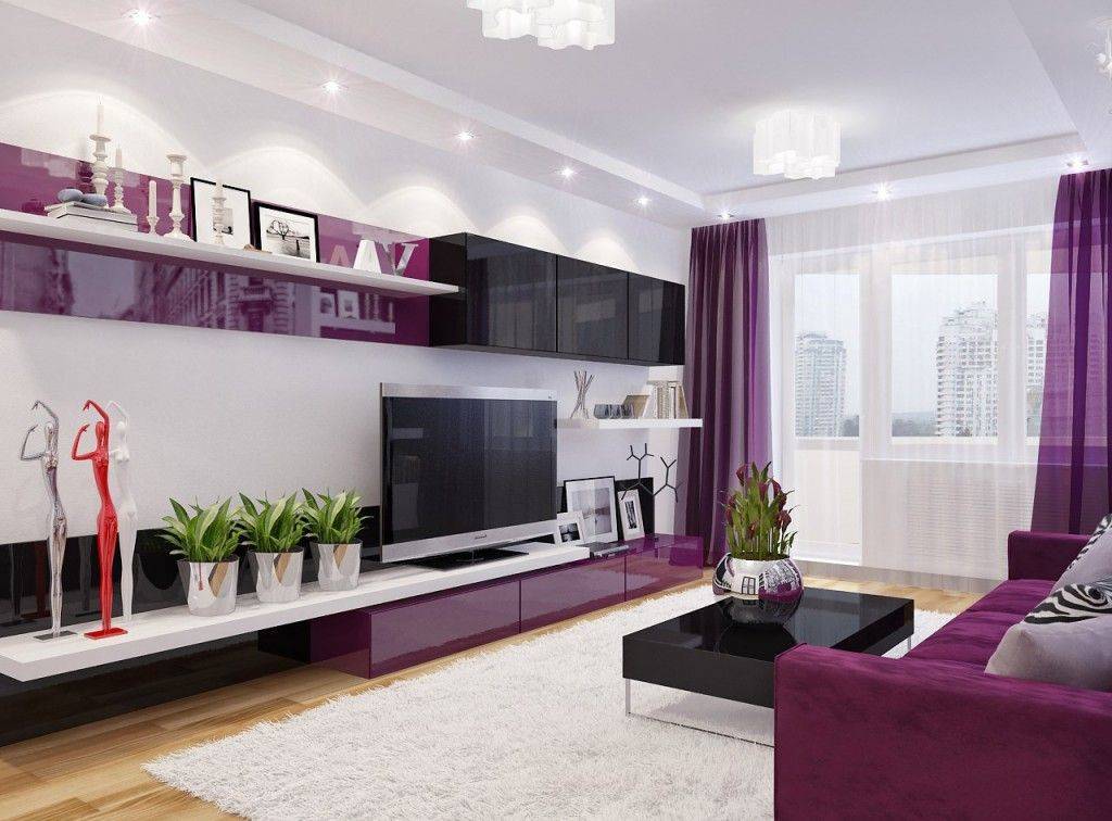 С черным получается слишком яркое и оттого не самое удачное сочетание. Однако если взять светлый или близкий к розовому тон фиолетового, комбинация станет более жизнеспособной и вполне подойдет к современной гостиной, особенно если разбавить эти два цвета белым.