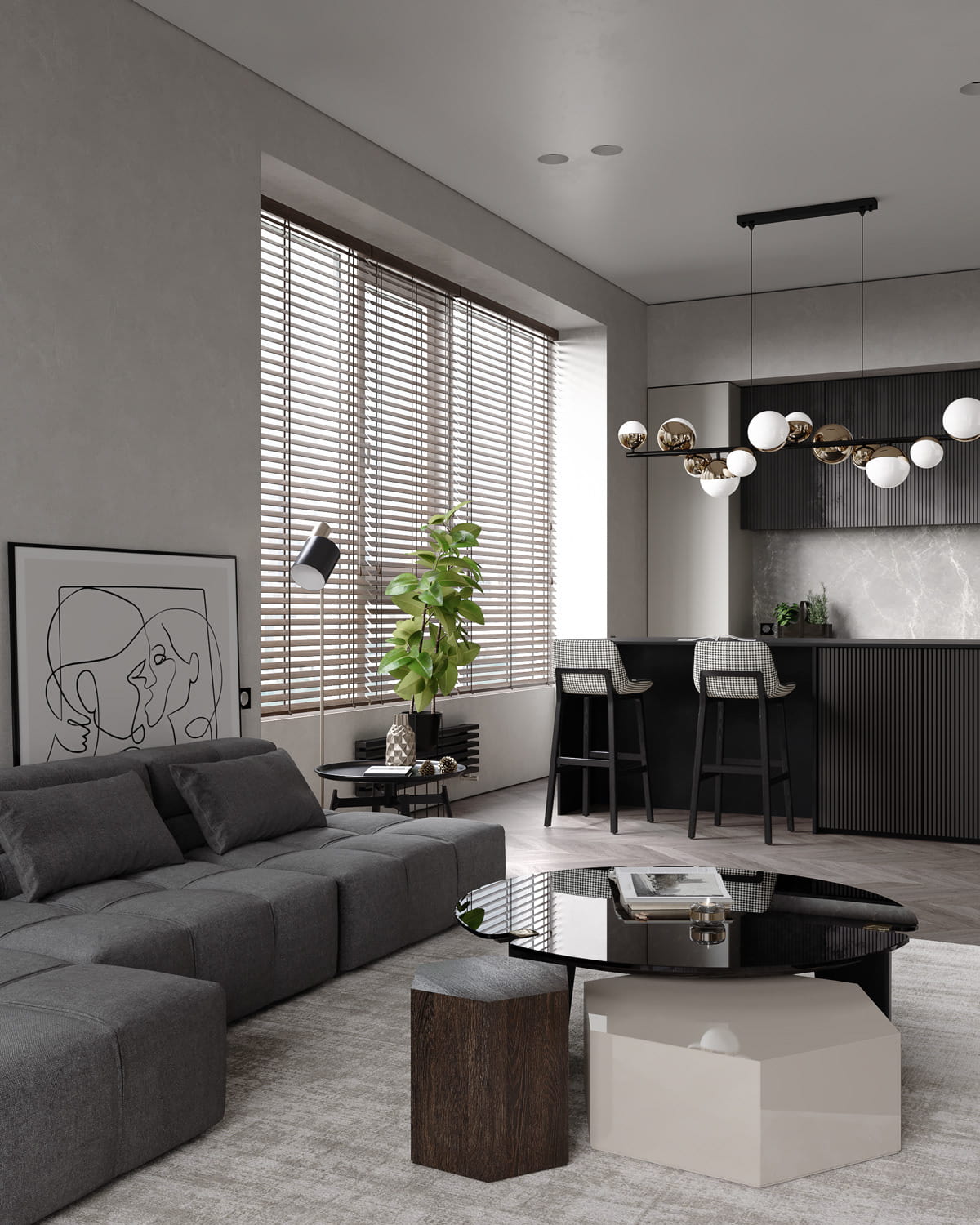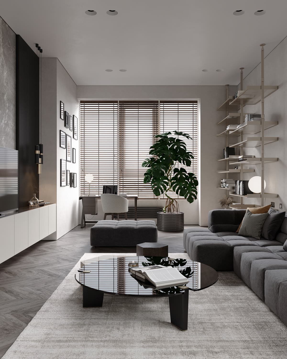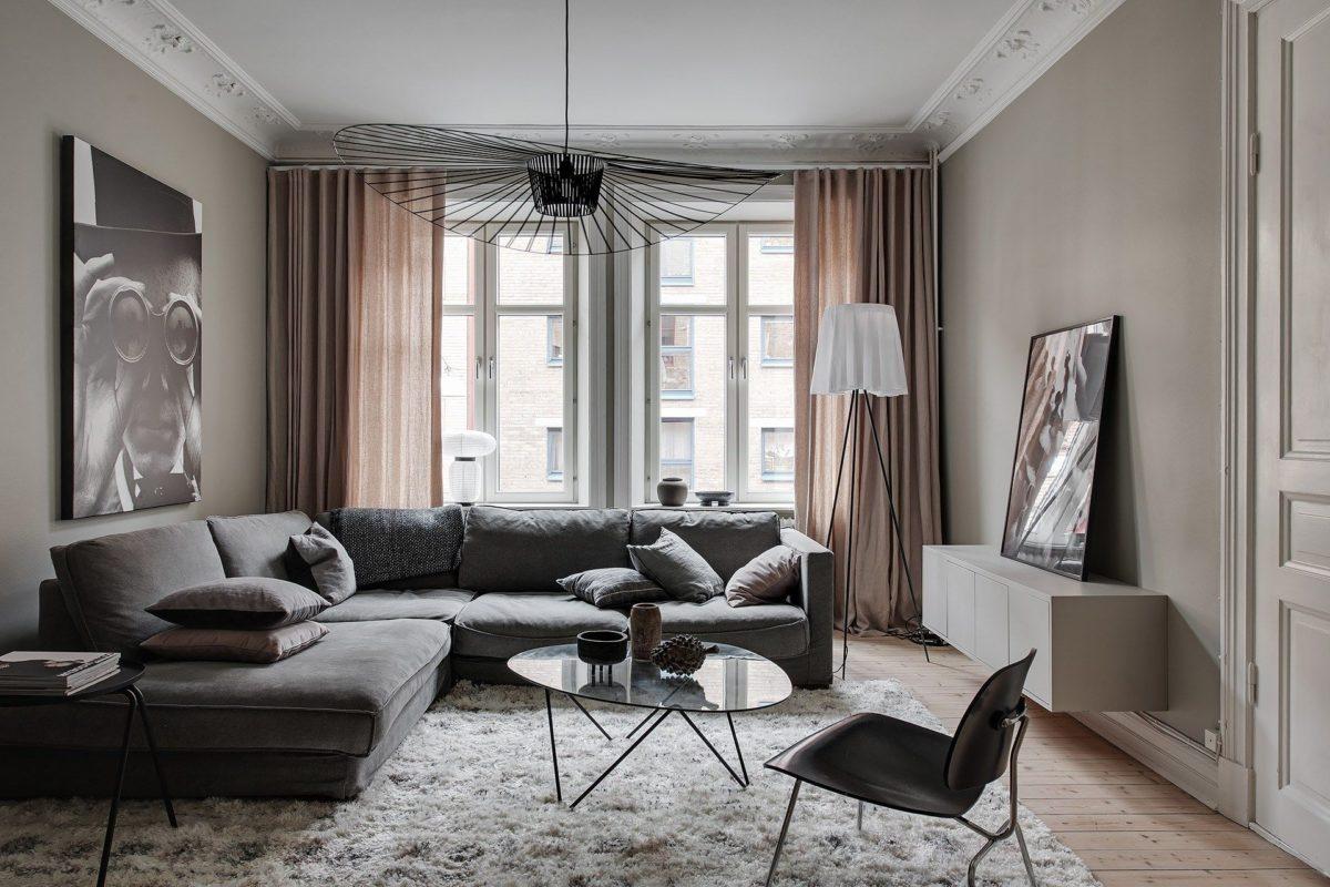 Интерьер гостиной в серо-бежевых тонах сочетает элегантность и уют. Такая цветовая гамма подходит как классике, так и или контемпорари. Если гостиная имеет небольшую площадь, лучше взять в качестве основного цвета беж, а в просторном помещении можно сделать доминирующим серый. С тёплыми серыми тонами хорошо сочетаются песочные и пудровые оттенки.