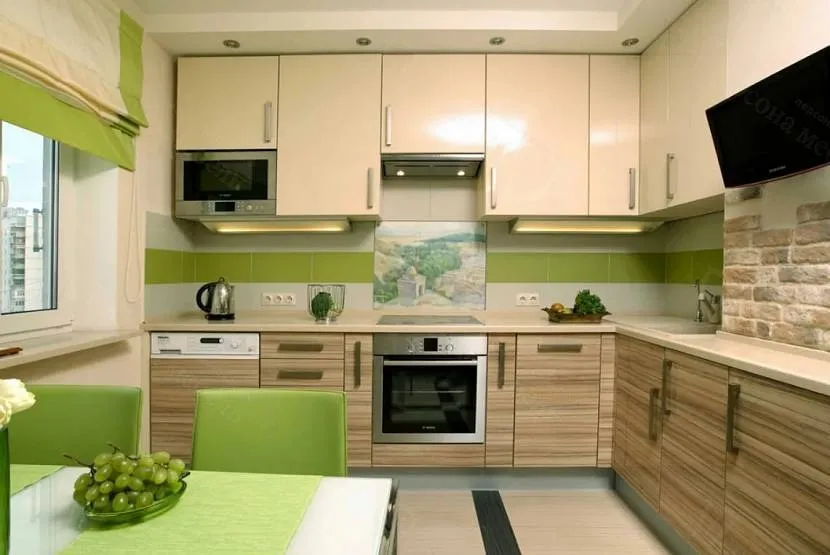 С помощью акцентных деталей помещение становится более динамичным. Главное соблюсти баланс и не перегрузить интерьер кухни размером10 кв.м. яркими штрихами. Часто акцентом интерьера выступает кухонный гарнитур на фоне нейтральных стен. Наиболее актуальными цветами являются салатовый, желтый или аквамариновый.