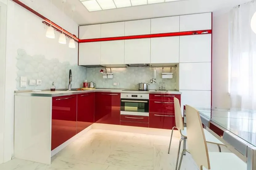 Для этого стиля характерны глянцевые поверхности с легким металлическим отблеском. Бытовая техника становится частью интерьера, у кухонного гарнитура должны быть четкие линии.