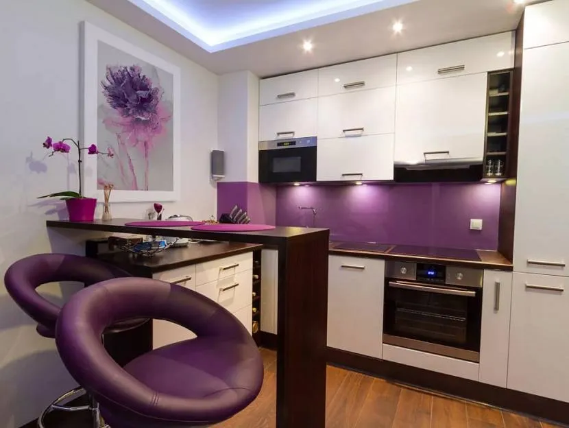 Но маленькая кухня, оформленная в темной гамме, выглядит не хуже. При выборе насыщенного цвета, будь то черный или фиолетовый, придется максимально тщательно осветить помещение. Уместны контрастные сочетания цветов, которые придадут пространству маленькой кухни недостающий объем. Следите за тем, чтобы в такие тона были окрашены значимые поверхности большой площади. Например, при черных мебельных фасадах белым может быть кухонный фартук или столешница. Но обилие мелких контрастных деталей создает пестроту, которой однозначно стоит избегать в дизайне 10-метровой комнаты. Темные тона предпочтительно использовать на нижних уровнях оформления, поближе к поверхности пола.