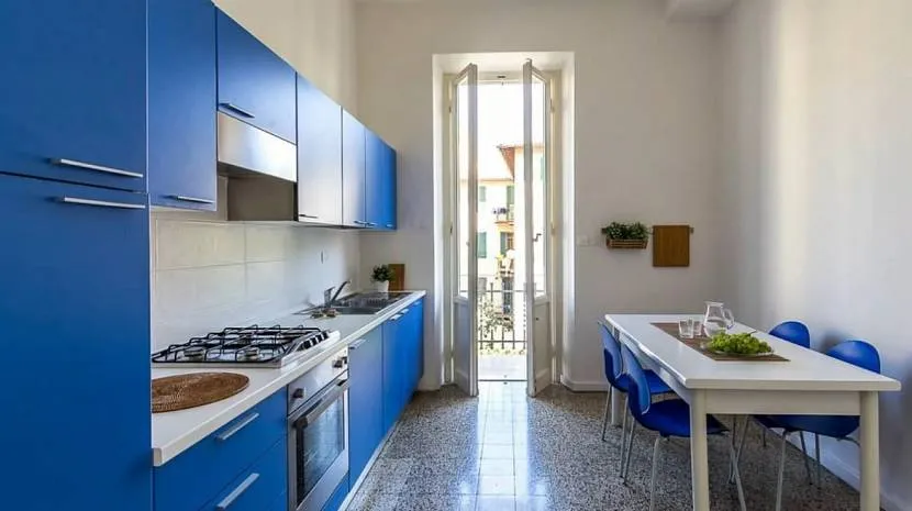 Идея подразумевает сочетание светлых тонов с вкраплениями мягких оттенков голубого. Готовый ремонт должен создавать впечатление неба над южными морями. Пол требует темного ламината, а светло-бирюзовый присутствует в небольших количествах: в расцветке фартука, стола или стульев, занавесок.