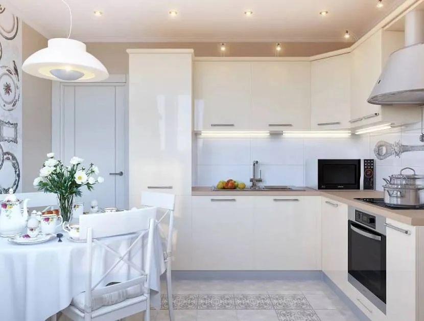 Потолок на маленькой кухне лучше сделать максимально простым и лаконичным — к примеру, натяжной матовый, оштукатуренный или окрашенный водоэмульсионной краской. Многоуровневые конструкции зрительно уменьшат высоту помещения, что нежелательно для 10-метрового помещения. Уместны подобные потолки лишь для зонирования: в случае, если кухня совмещена с гостиной.