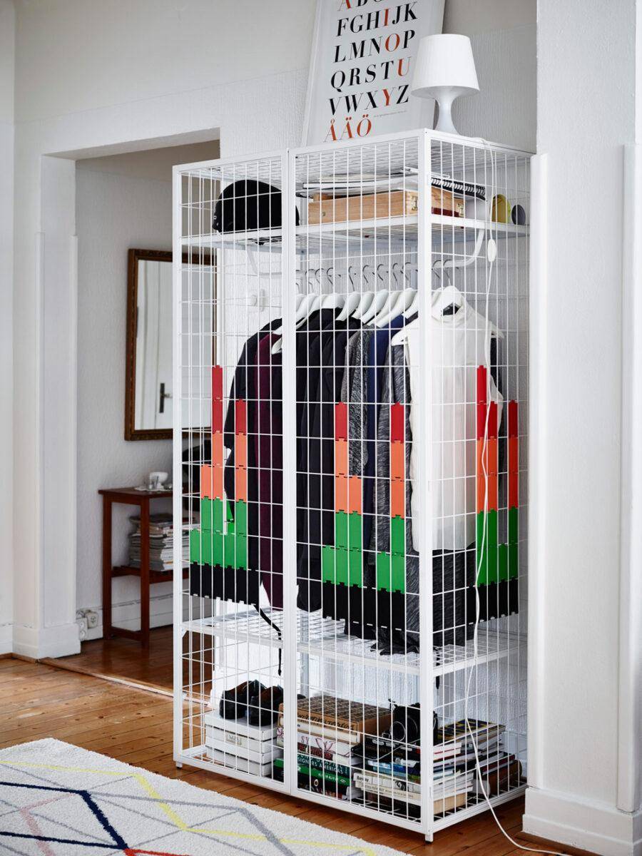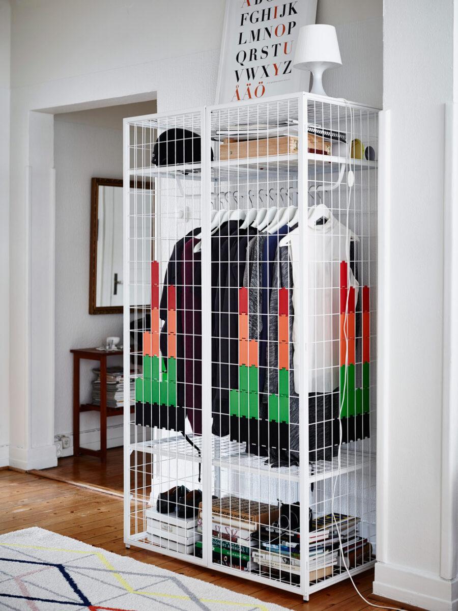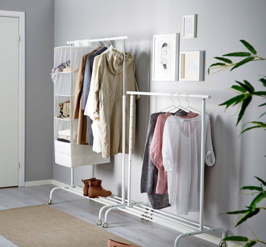 Если пространства мало и полноценный шкаф в него не вмещается, то стоит рассмотреть вариант хранения на вешалках. В IKEA представлены различные модели: от совсем маленьких подвесных до полноценных напольных.