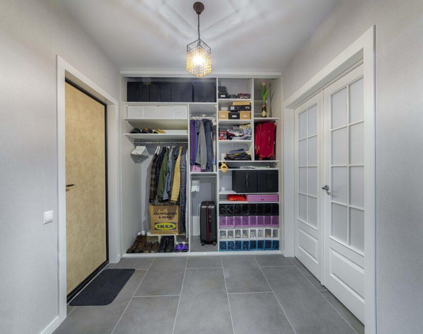 Как и в предыдущем случае, в первую очередь необходимо обратить внимание на шкаф для одежды. В идеале он должен также обладать отсеком для головных уборов и обуви