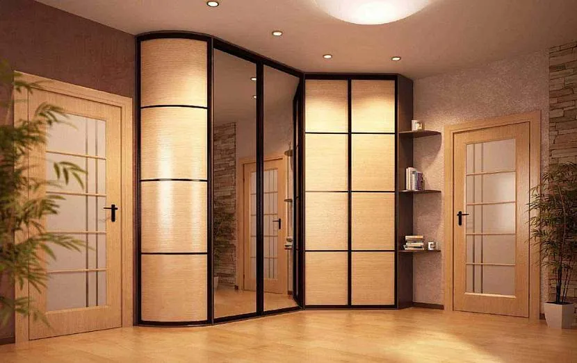 - Популярностью пользуются конструкции с угловым расположением. Сюда можно отнести Г-образные модели, пятистенные и радиусные. При этом стоит помнить, что радиусный шкаф требует много свободного места, а угловой, наоборот, компактный, но очень вместительный.