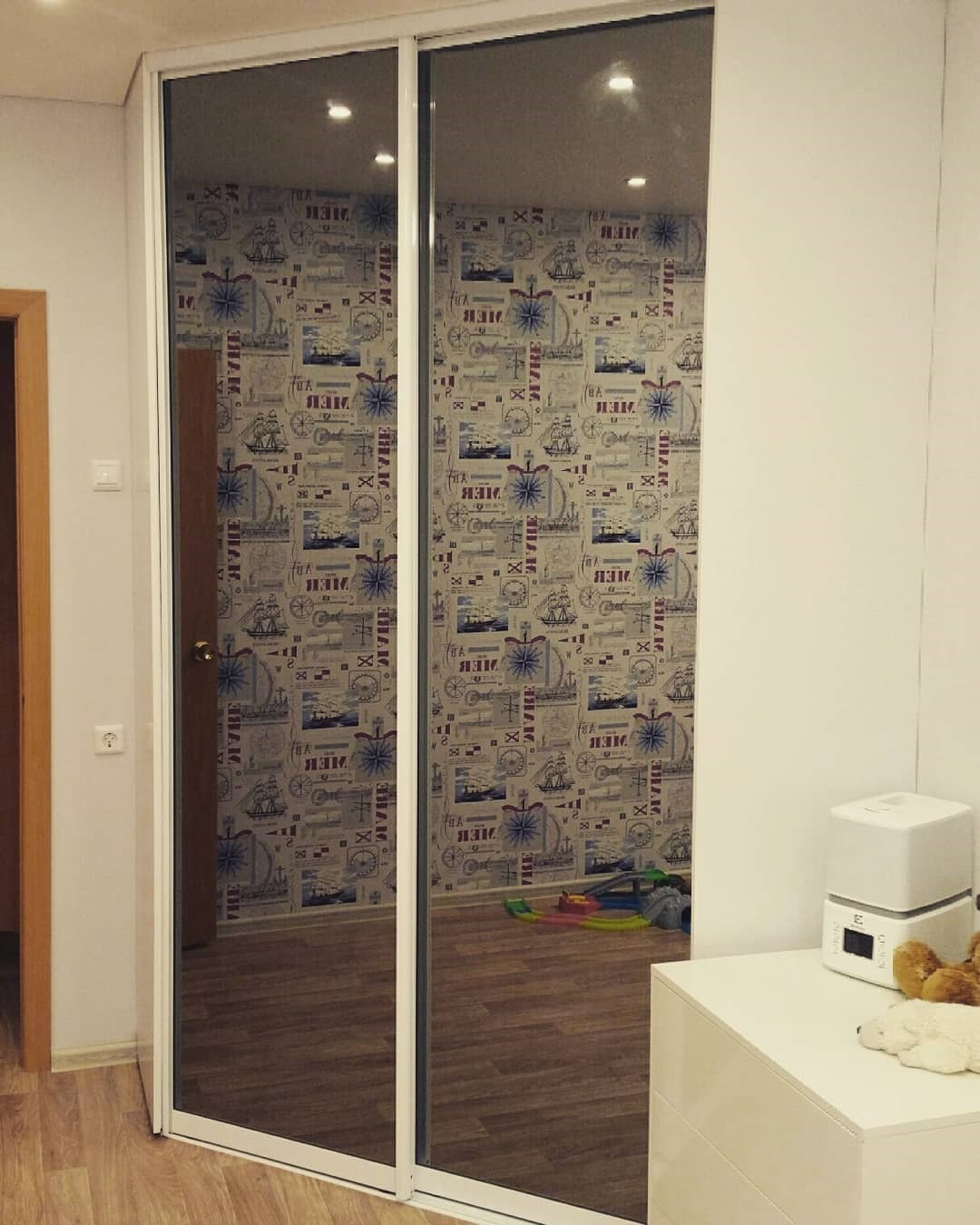 После того как полностью собран каркас шкафа и установлен в нишу, настало время для монтажа раздвижных дверей шкафа купе своими руками. Следует заметить, что фурнитура для таких дверей разнится по стоимости и качеству, и потому оптимальным вариантом будет крепкий середнячок, то бишь средняя по стоимости фурнитура. Из дверной фурнитуры понадобится: набор нижних и верхних роликов, и специально направляющие ручки и иные элементы. Для того, чтобы заполнить дверной проём у шкафа-купе можно использовать декоративное зеркало.