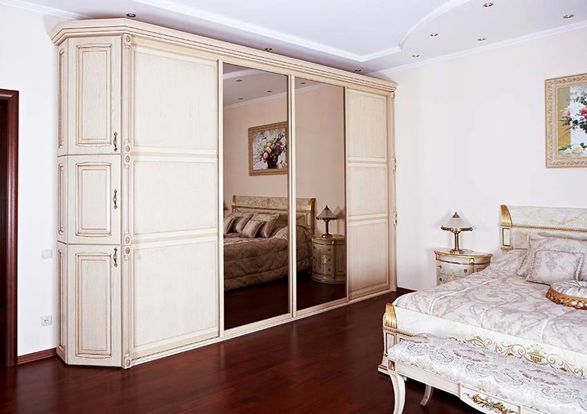 Радиальный шкаф. Подходит для просторной спальни, имеет округлую форму и часто дополняется раздвижными дверями. Дизайн соответствует расслабляющей атмосфере комнаты.