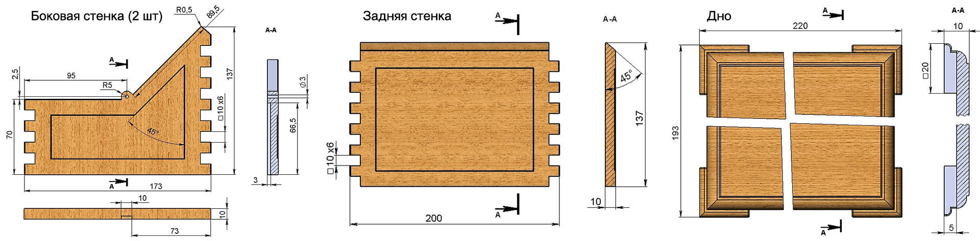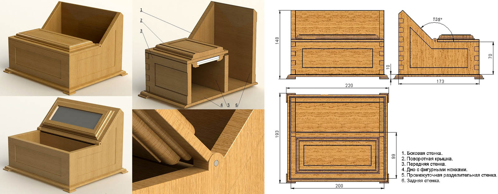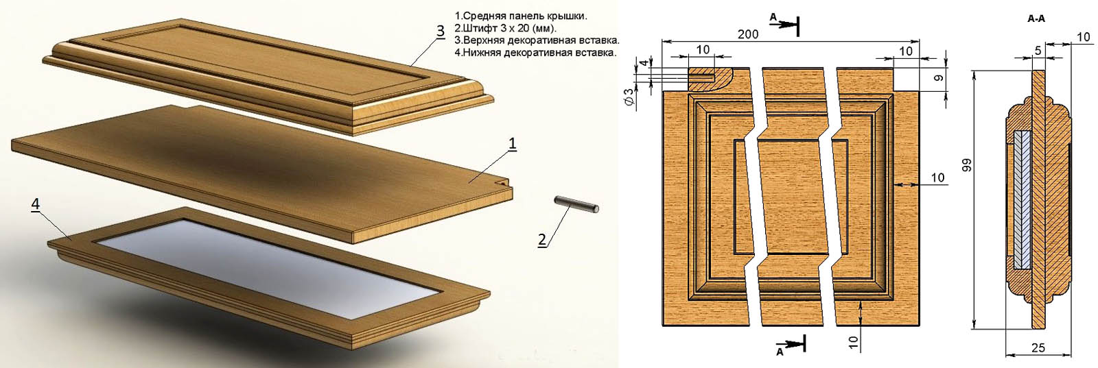Если крышка накладная, детали для верхней и нижней частей расчерчивают и изготавливают отдельно. Подобные схемы встречаются довольно часто, и размеры в них можно менять, но при этом пропорции должны оставаться прежними. Крышка должна быть чуть шире, иначе она просто не наденется сверху.