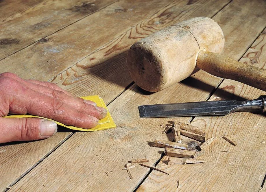 Если между половой доской имеются зазоры, тогда рекомендуется снять все покрытие и переложить его заново. Если зазоров немного, тогда можно обойтись древесиной и клеем. Если провести по поверхности пола рукой, гвозди и саморезы не должны чувствоваться. Для комфорта при проведении работ снимают также и плинтуса.
