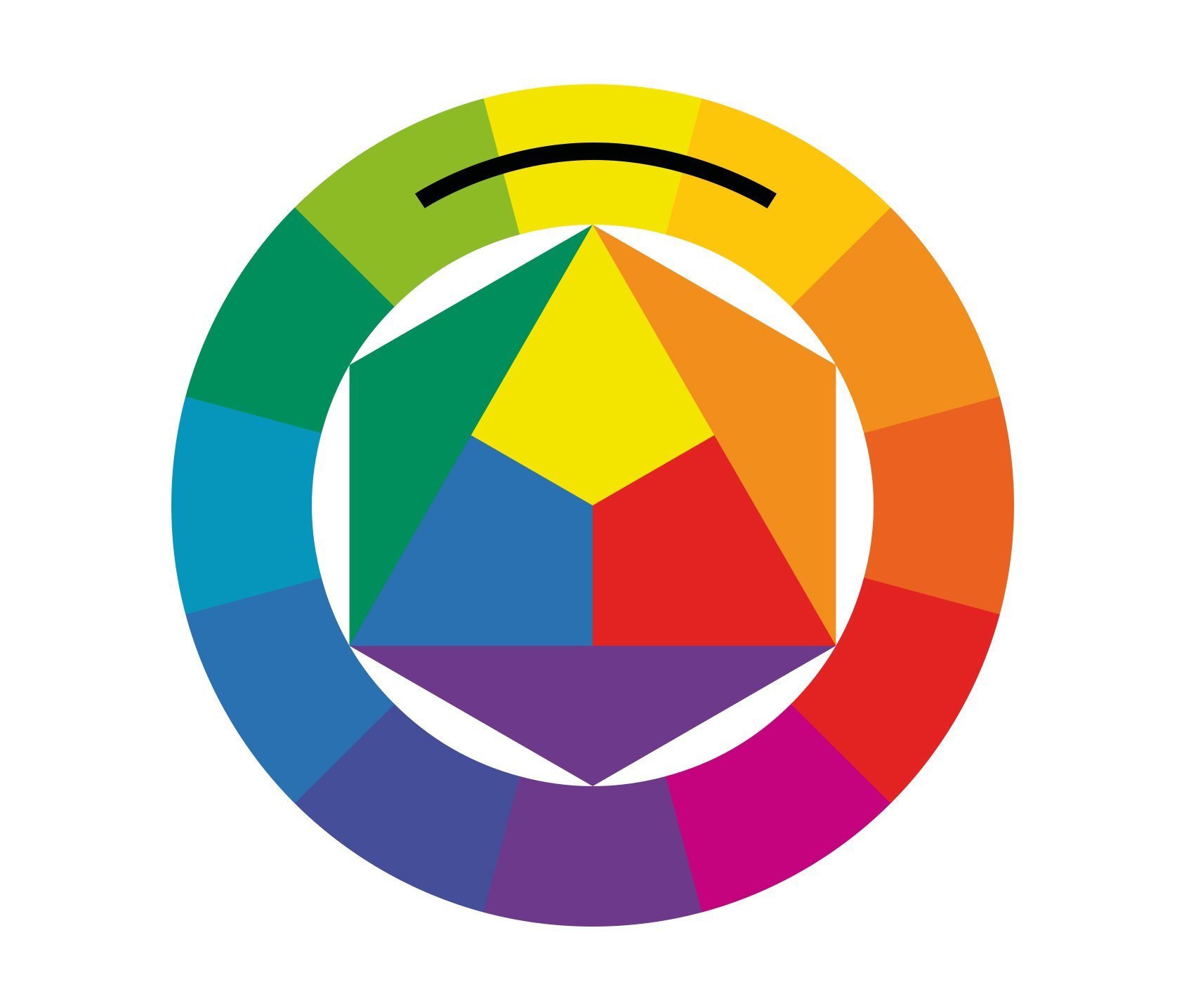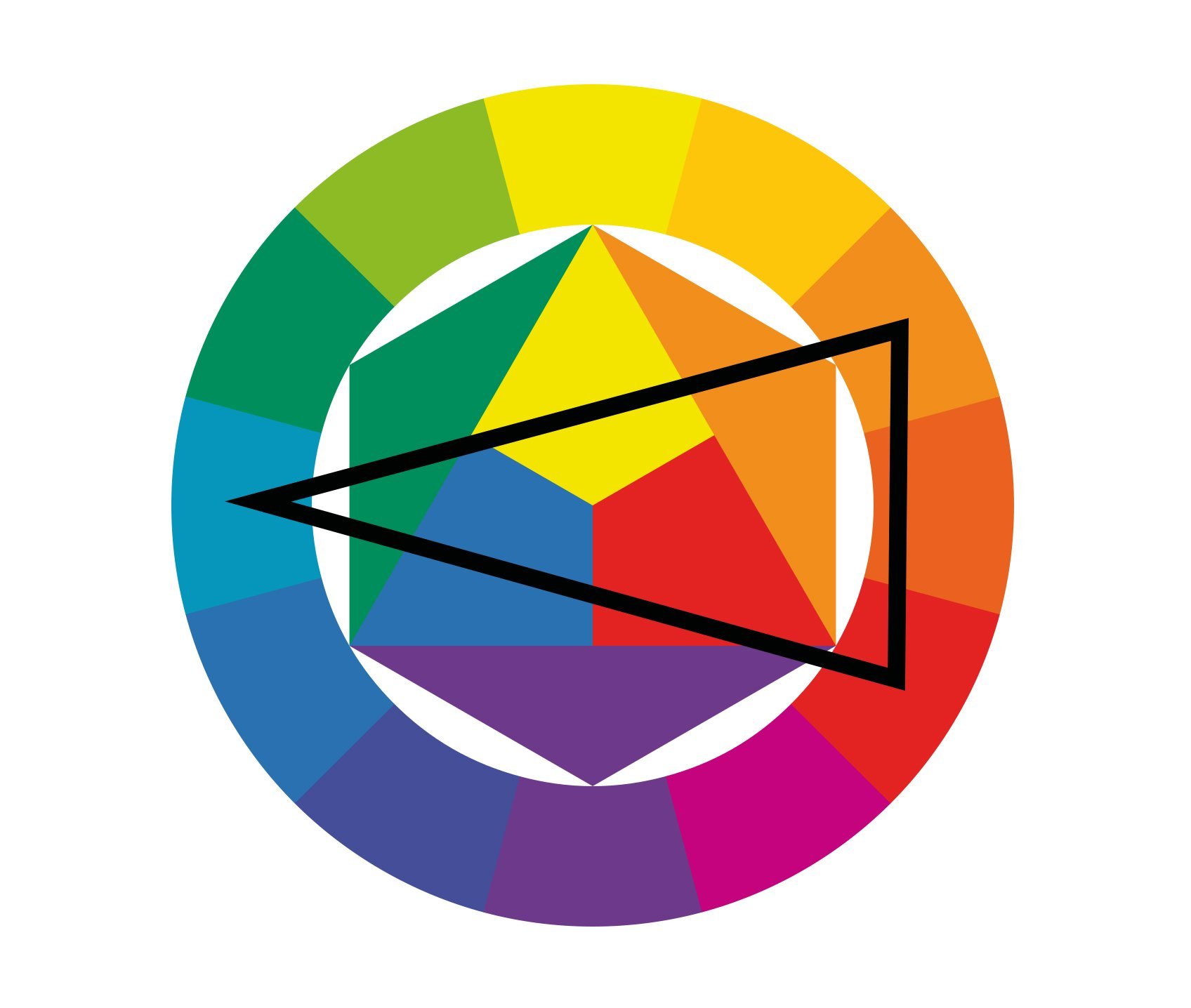 Если вы хотите смягчить контраст, то используйте равнобедренный треугольник с острым углом — он будет обозначать основной цвет, а два других будут второстепенными или акцентными. Так, например, в случае с красным это будут сине-зеленые и желто-зеленые оттенки.