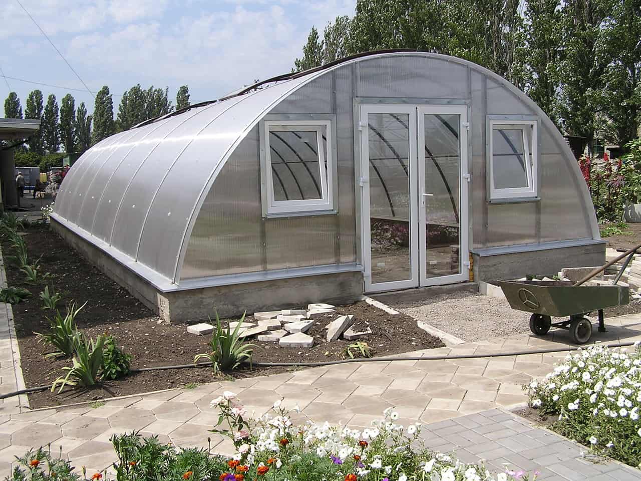 Поликарбонат позволяет сохранять тепло, пропускает свет, а также обладает небольшим весом, то есть отпадает необходимость в громоздком каркасе.