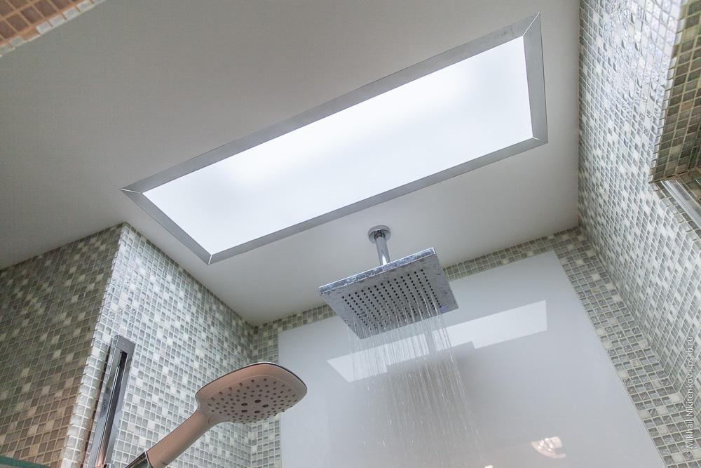 Потолок в ванной даже в зоне душа можно делать натяжной. Никаких проблем с ним нет, главное не делать там светильник либо использовать со степенью защиты IP67.