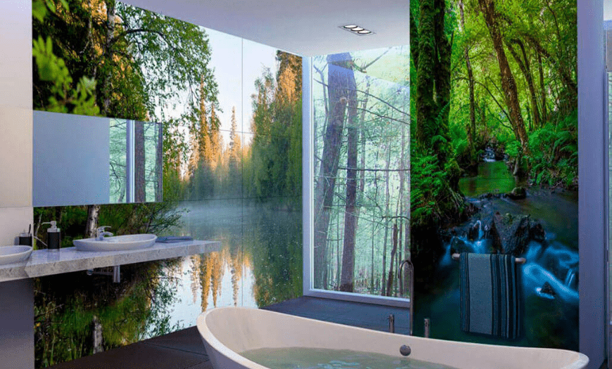 Необычный образ маленькому пространству придает отделка панелями, выполненными из закаленного стекла. Можно подобрать образцы с рисунком. Удивительный эффект придает подсветка. В этом варианте помещение приобретает перспективу.