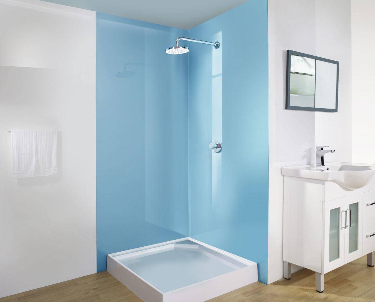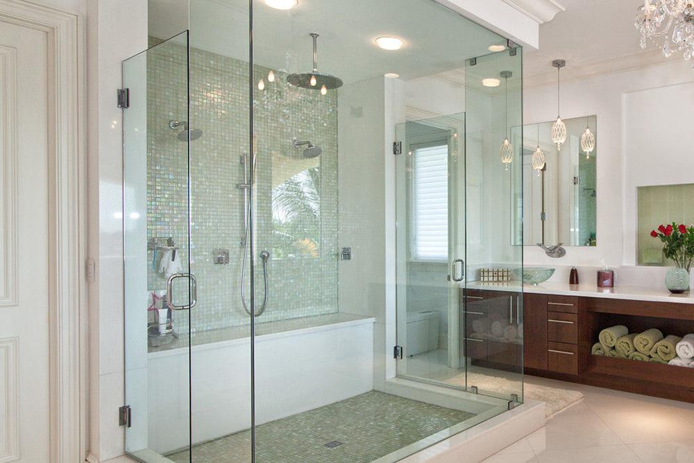 Если у вас в доме плохая вода(хлорка и много растворённых солей), то стекло для дверей и стен лучше брать черное. Можно и прозрачное и матовое тонированное. Изнутри оно будет всё в белых отложениях, зато снаружи будет не видно. Тонированное белое выглядит убого. Черное — норм.